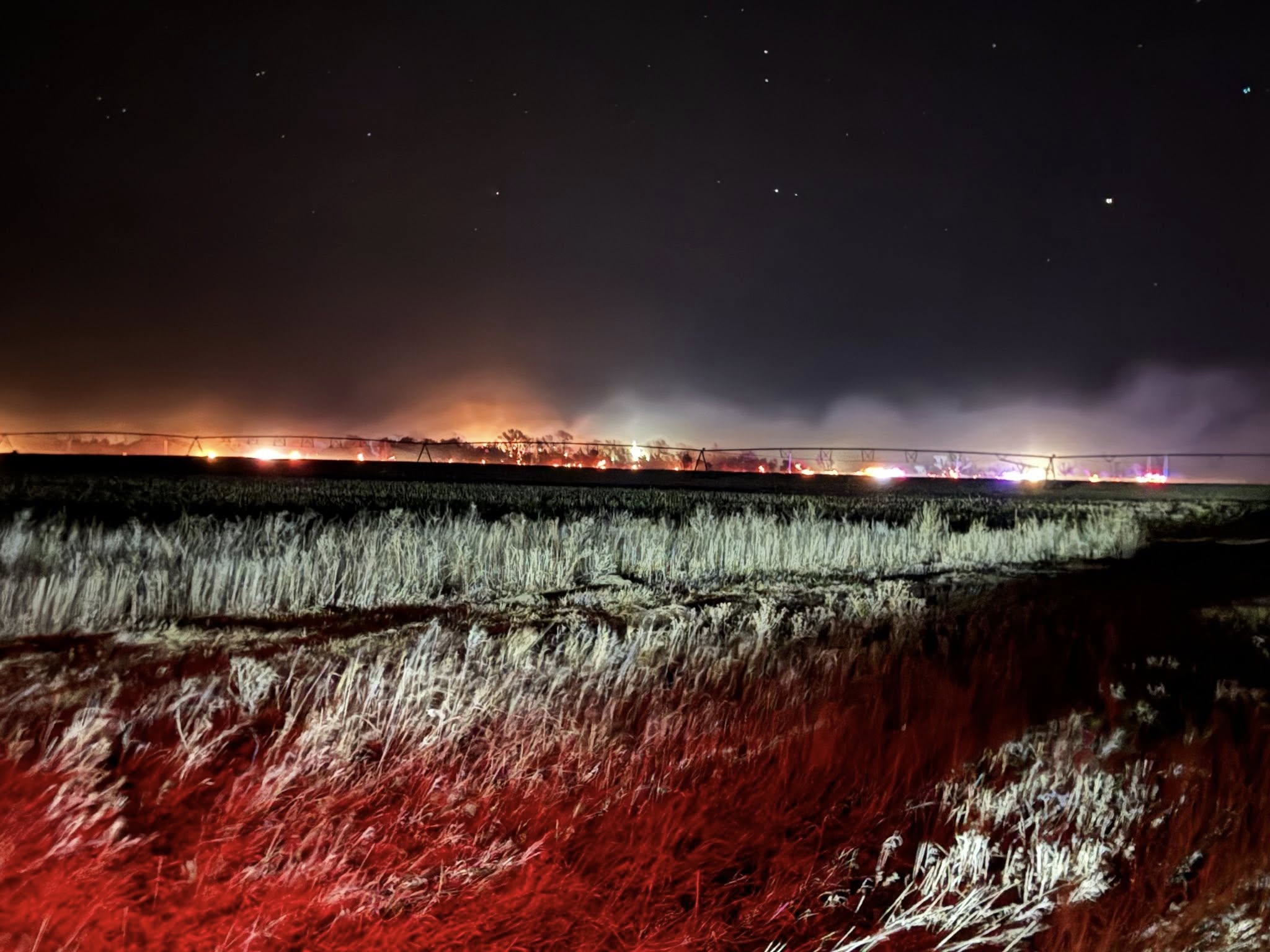 Crews have divided the fire into two separate areas as they work to prevent it from spreading into tree groves and hay stacks.