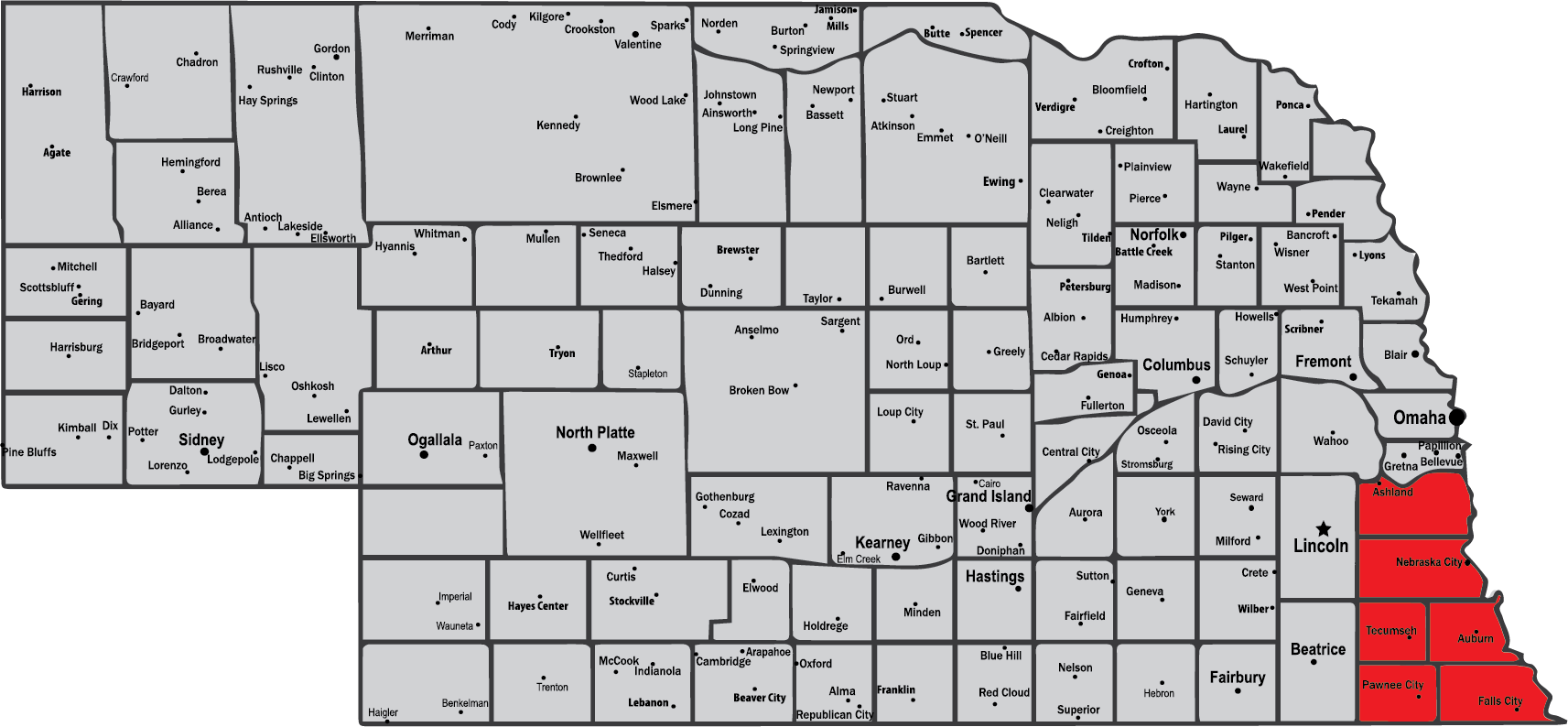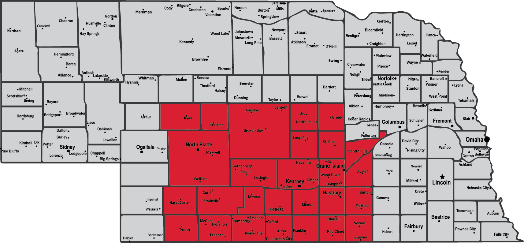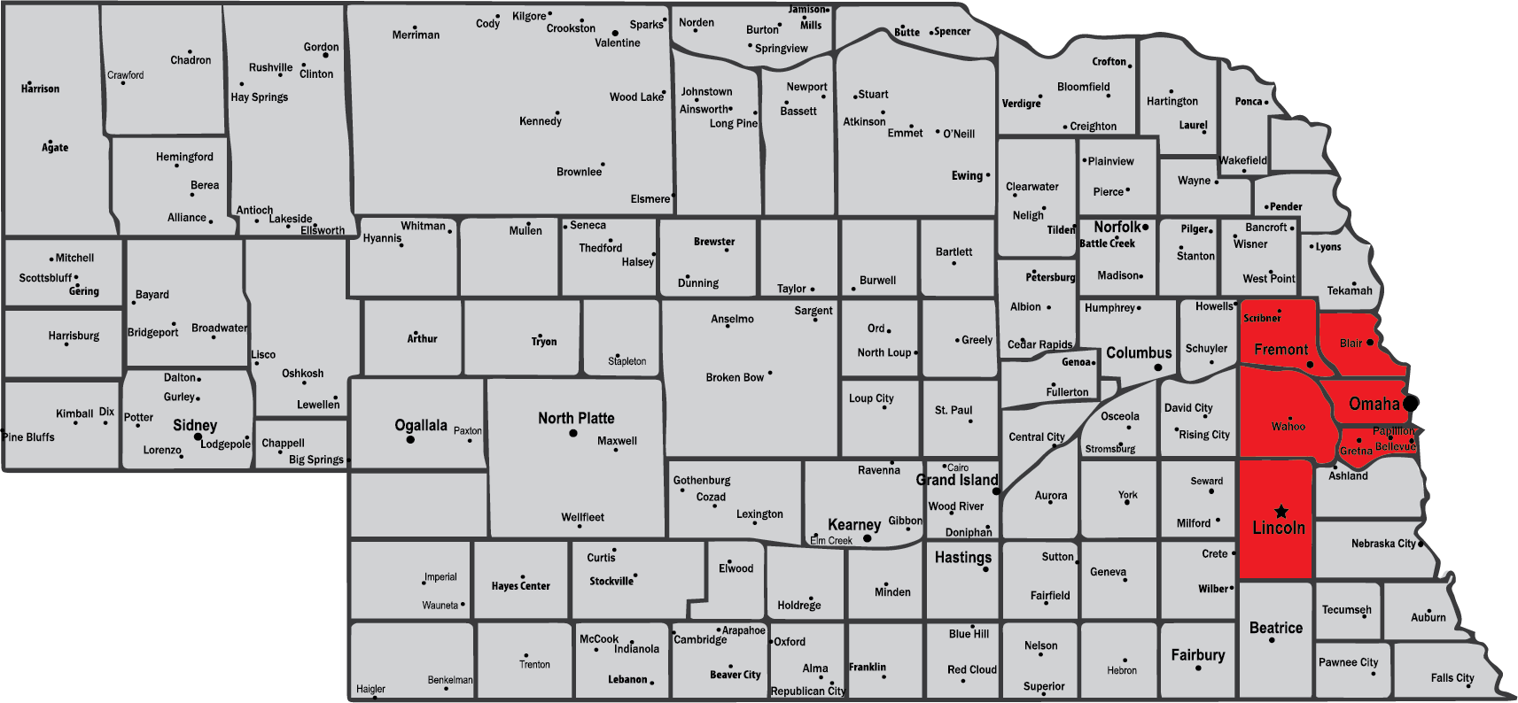 | Central Surrounding Areas: Kearney, Grand Island, Hastings, North Platte Counties: Adams, Buffalo, Clay, Custer, Dawson, Franklin, Frontier, Furnas, Gosper, Greeley, Hall, Hamilton, Harlan, Hayes, Hitchcock, Howard, Kearney, Logan, Lincoln, McPherson, Merrick, Nuckolls, Phelps, Red Willow, Sherman, Valley, Webster | | Metro Surrounding Areas: Omaha, Lincoln, Fremont, Blair Counties: Dodge, Douglas, Lancaster, Sarpy, Saunders, Washington |