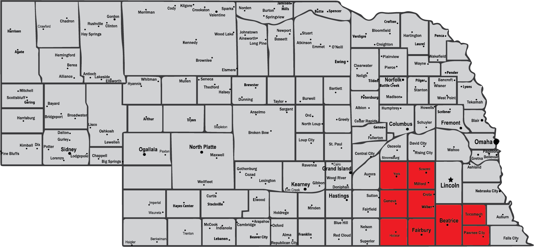 | Platte Valley Surrounding Areas: Columbus, Albion, Fullerton, David City Counties: Boone, Butler, Colfax, Nance, Platte, Polk | | River Country Surrounding Communities: Nebraska City, Fall City, Pawnee City, Auburn Nebraska Counties: Cass, Johnson , Nemaha, Otoe, Pawnee, Richardson Iowa Counties: Mills, Fremont, Montgomery, Page Missouri Counties: Atchison |