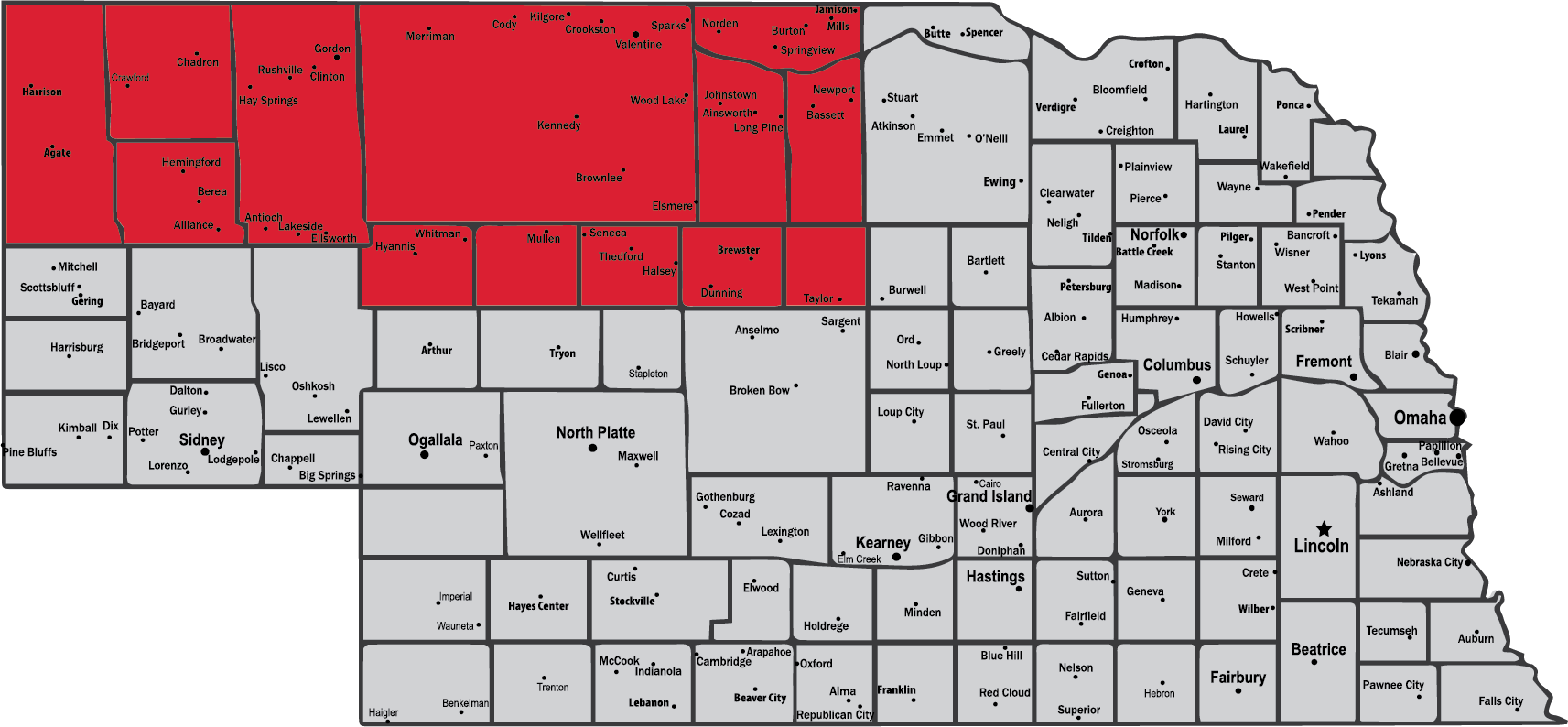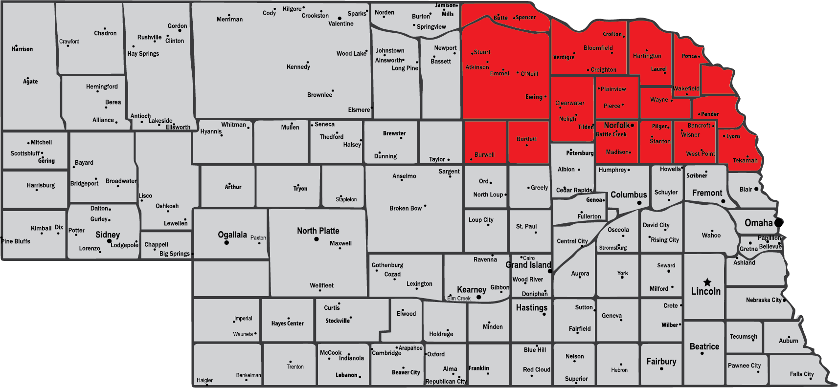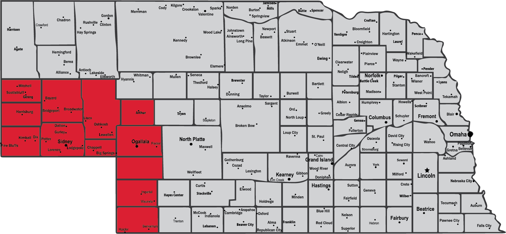 | Northeast Surrounding Areas: Norfolk, Wayne, Madison, Wakefield, Neligh, O'Neill, West Point Counties: Antelope, Boyd, Burt, Cedar, Cuming, Dakota, Dixon, Garfield, Holt, Knox, Madison, Pierce, Stanton, Thurston, Wayne, Wheeler | | Panhandle Surrounding Communities: Sidney, Kimball, Ogallala, Scotts Bluff, Bridgeport, Chappell, Grant, Imperial, Julesburg, Oshkosh, Sterling Nebraska Counties: Arthur, Banner, Chase, Cheyenne, Deuel, Dundy, Garden, Keith, Kimball, Morrill, Perkins, Scotts Bluff Colorado Counties: Logan, Phillips, Sedgwick Wyoming Counties: Laramie, Goshen |