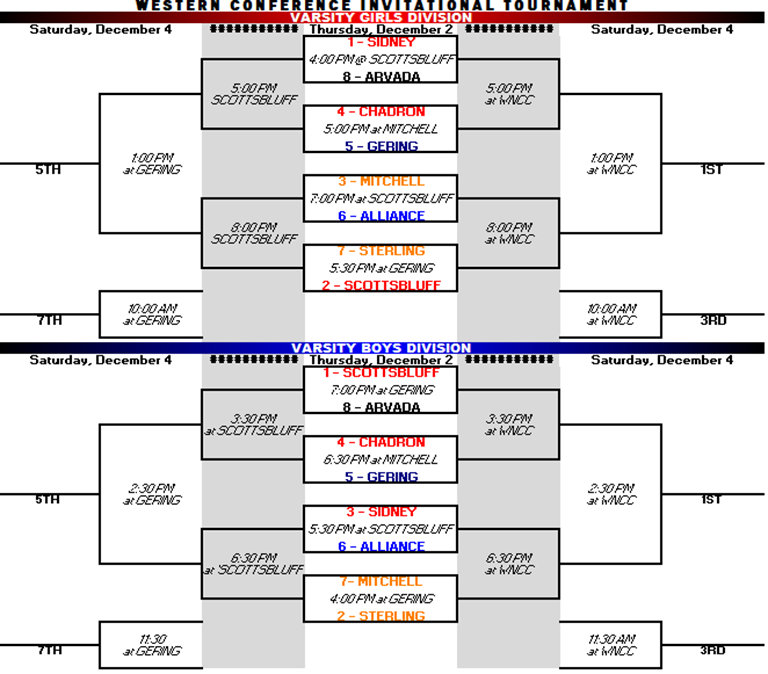 Western Conference members Alliance, Chadron, Gering, Mitchell, Scottsbluff, and Sidney are joined by teams from Sterling and Arvada Colorado to form the 3-day tournament. Games begin on Thursday at Gering, Mitchell, and Scottsbluff high Schools. First round winners will advance to the semifinal round at Western Nebraska Community College on Friday, while consolation games will be played at Scottsbluff High School. Championship and Third Place games will take place at W.N.C.C. on Saturday. Fifth and Seventh place games will be held on Saturday at Gering High School.