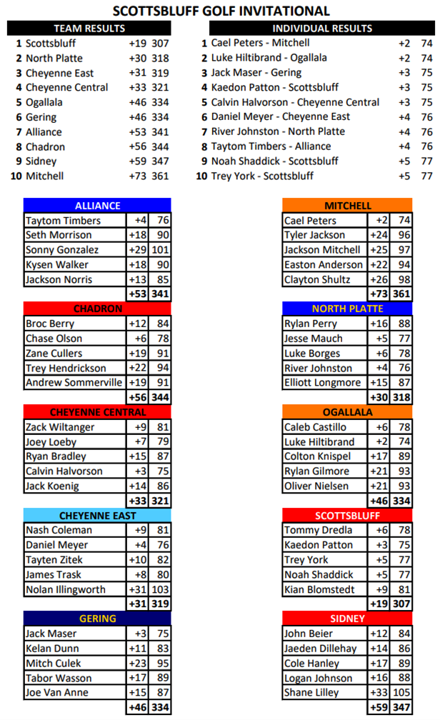 Sidney struggled on the Scottsbluff Country Club course as the Red Raiders low golfer was John Beier with a 12-over par 84 to finish in 24th place. Jaeden Dill was two shots behind, carding an 86.