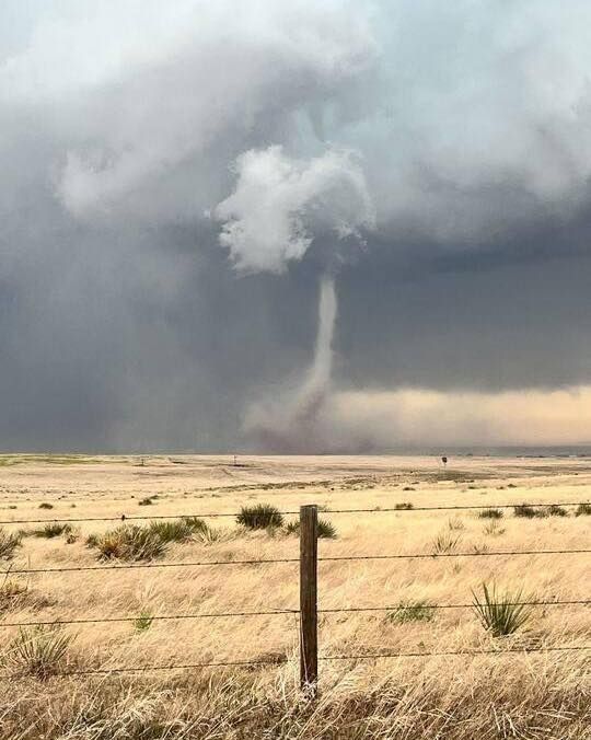 A photo posted by the National Weather Service office in Cheyenne showed the landspout tornado near Hawk Springs in Goshen County, Wyo. at 2:45 p.m. The tornado remained on the ground for approximately five minutes. No damage was reported. Tennis ball size hail was also reported near Hawk Springs.