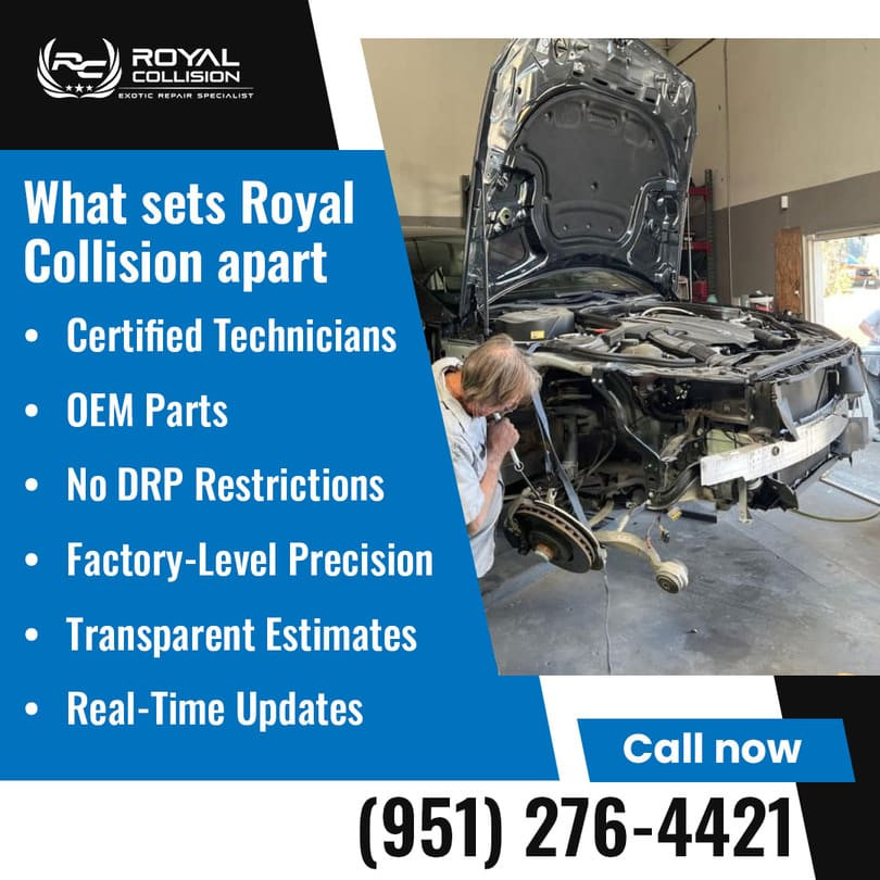 Royal Collision offers expert collision repair, OEM-certified bodywork, advanced ADAS recalibration, and clear, upfront repair estimates for Riverside drivers. Drivers seeking collision repairs backed by OEM parts and factory-trained technicians can count on precise, safe results. The shop remains one of the most trusted auto body repair facilities in Riverside, known for consistency, clear communication, and factory-level accuracy. For those searching for a reliable auto body shop in Riverside or nearby areas, Royal Collision continues to be a top-rated choice. To schedule certified collision repair or request a detailed estimate, call (951) 276-4421 or email ryan@royalcollisionriverside.com today.